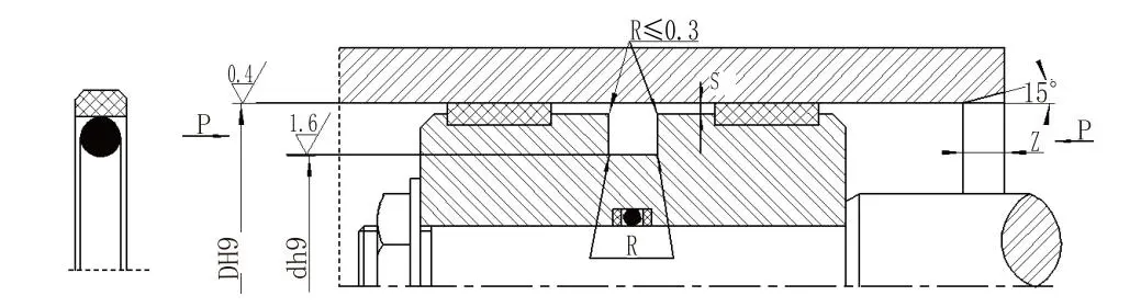 Segel kombinasi persegi (Glyd Ring Seal) untuk piston (bore) terdiri dari cincin penyegel persegi panjang berisi PTFE dan cincin-O. Sangat cocok untuk penyegelan tekanan dua arah dalam gerakan hidrolik bolak-balik. O-ring memberikan gaya radial dan mengkompensasi keausan cincin seal. Biasanya digunakan bersama dengan cincin pemandu. Untuk diameter silinder kurang dari 30mm, desain alur terpisah (terbuka) harus digunakan.