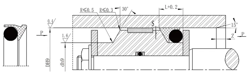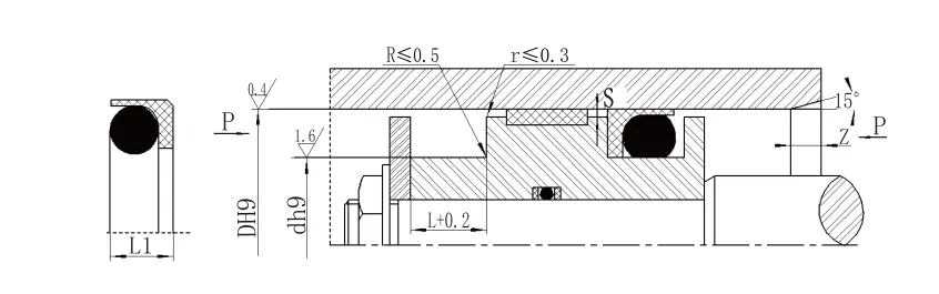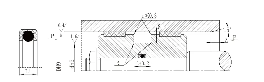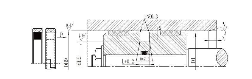 | Rentang aperture D H9 | Diameter alur D H9 | Lebar alur L+0.2 | Tinggi segel L1 | Sudut bulat RMax | Clearance radial sMax | Talang ZMin | Diameter kawat o-ring DO | |