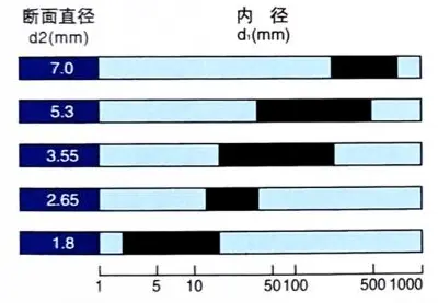 | Diameter dalam | 1.80 ~ 6.30 | 6.70 ~ 11.20 | 11.8 ~ 21.2 | 22.4 ~ 40.0 | 41.2 ~ 80.0 | 82.5 ~ 160 | 165 ~ 300 | 300 ~ 650 | 670 ~ 910 | 910 ~ 1180 |